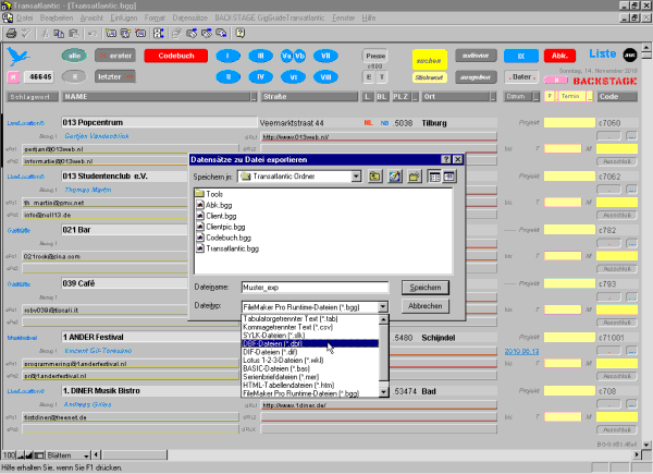 Sämtliche Felder der ausgewählten Datensätze kannst Du in den gängigsten Formaten wie Text mit Tab, Text mit Komma, sylk, dbf, dif, wks, basic, Serienbrief, html-Tabelle exportieren. |