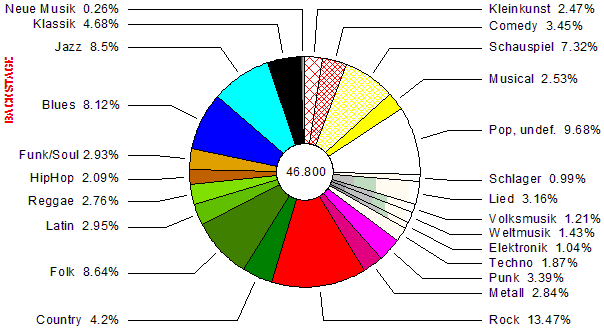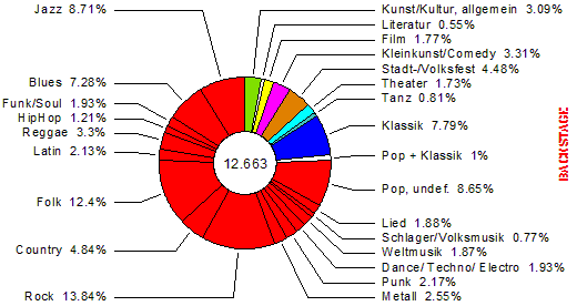 Anhand der definierten Genres aus dem Gig Guide läßt sich schließen, daß etwa 85% der Liveunterhaltung Europas und Nordamerikas aus Musikprogramm besteht. |