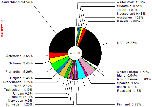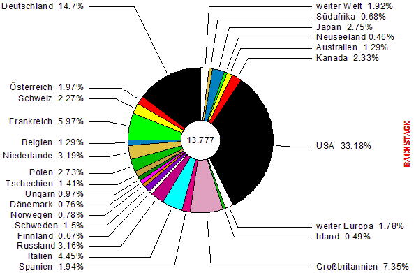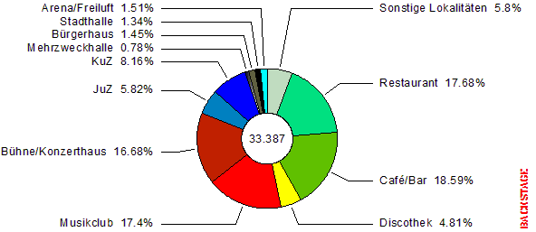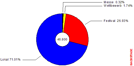 | 46.800 Auftrittsmöglichkeiten, davon 33.387 Bühnen und Lokale plus 12.663 Festvals, dazu hunderte von Musikwettbewerben und -messen. Maßgeschneidertes Netzwerk für Musiker, Manager, Booker, Promoter und Veranstalter. Int'l Szeneführer und Schnittstelle zwischen Musiker und Publikum. Seit dem ersten Erscheinen 1995 hat der BACKSTAGE Gig Guide seine Spitzenstellung als ultimativer Livemusikatlas kontinuierlich ausgebaut und sich als bewährter Gig-Finder obendrein den ehrenvollen Ruf als "Überlebenshandbuch für Musiker" und "Booker's Bible" erworben. Nicht ohne Grund, schließlich bietet der Gig Guide seit über zehn Jahren die größte Jobbörse für Musiker aller Stilrichtungen. Wenn Du also wirklich wissen willst, wo die Musik spielt, ist der BACKSTAGE Gig Guide die erste Wahl, wie die untenstehenden Graphiken und Bildschirmfotos veranschaulichen. |